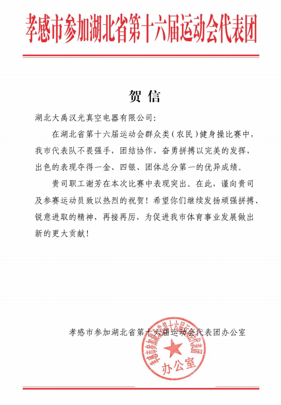 下圖為湖北省第十六屆運(yùn)動會代表團(tuán)辦公室發(fā)來的感謝信!